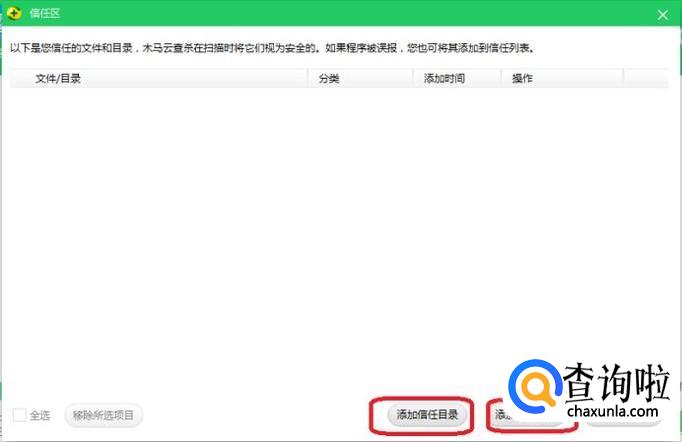 在出现的“信任区”选项框中,点击“添加信任目录”和“添加信任文件”就可以设置整个文件夹或者单个应用程序和文件为信任的了。