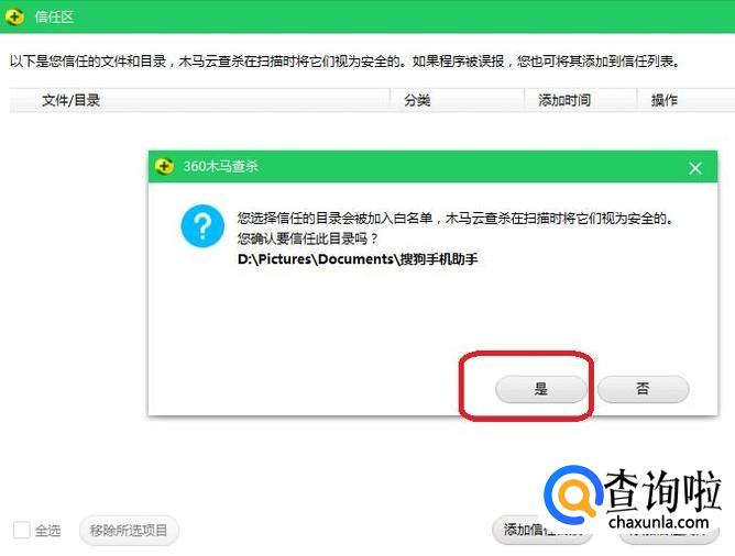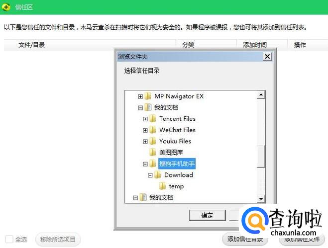 比如,我点击“添加信任目录”,选择我的文档里面的“搜狗手机助手”,防护软件就会信任该文件夹和里面的应用程序。