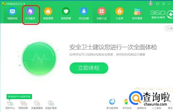 打开360安全卫士,看到如下界面,点击“木马查杀”。