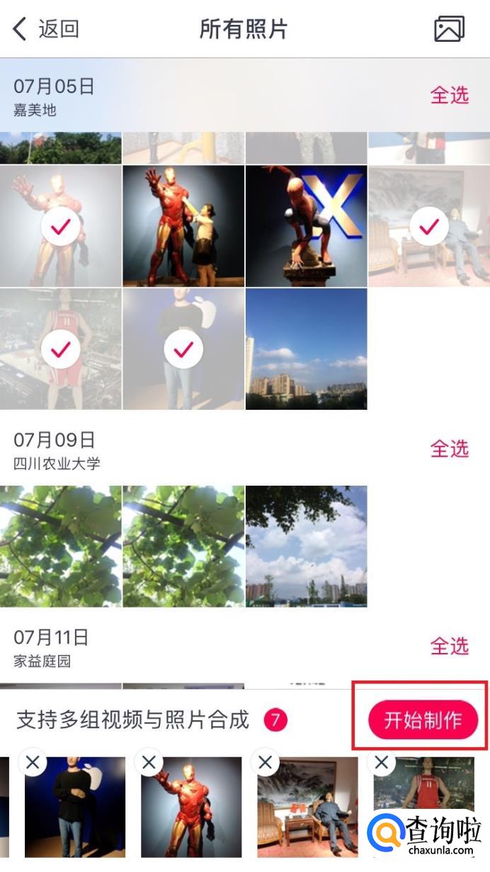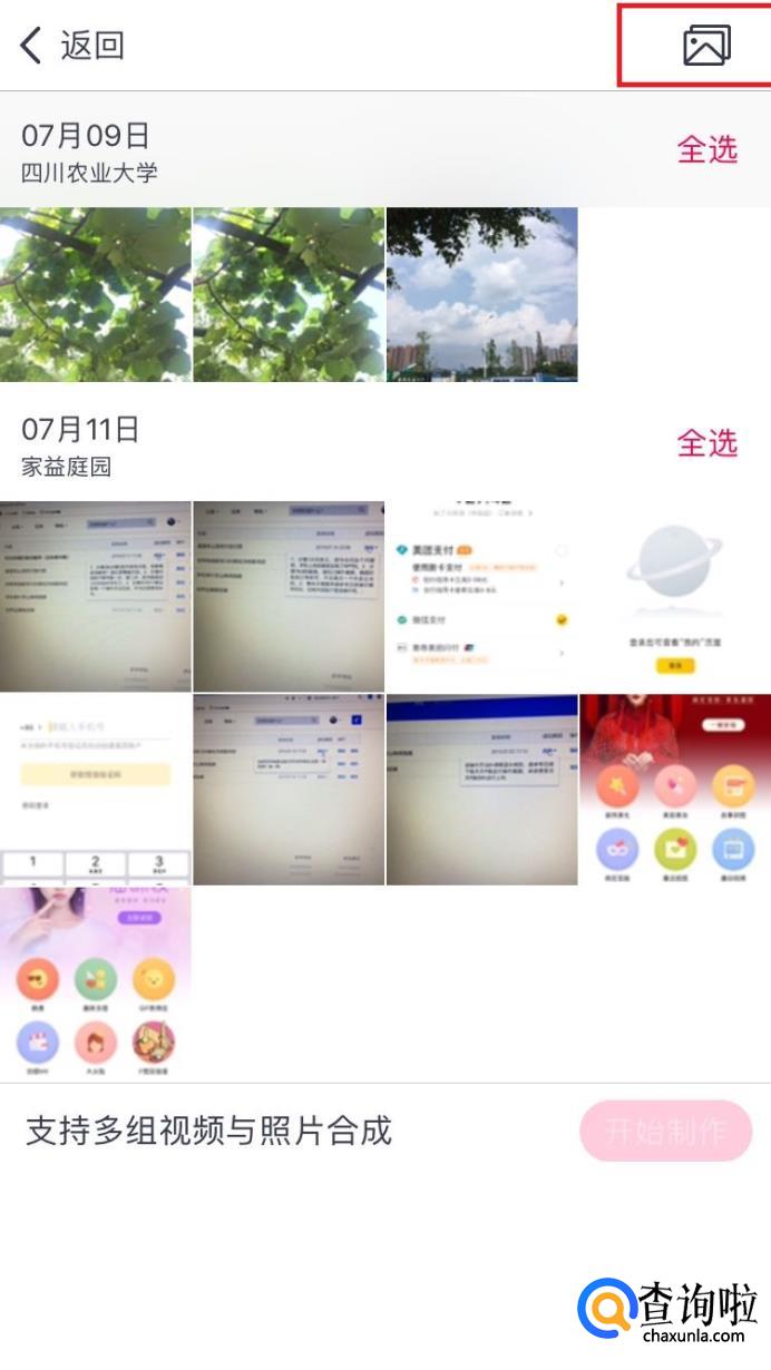 点击右上角相册标志,进入手机相册,选择需要制作成视频的照片。