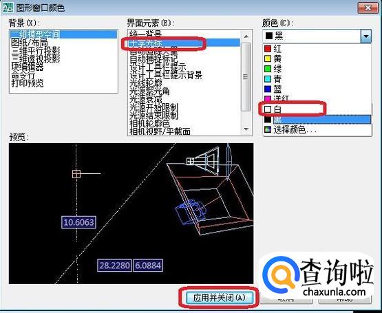 在“图形窗口颜色”面板中,界面元素中选择“十字光标”,然后在“颜色”中对应改为“白色”,点击“应用并关闭”就可以了。
