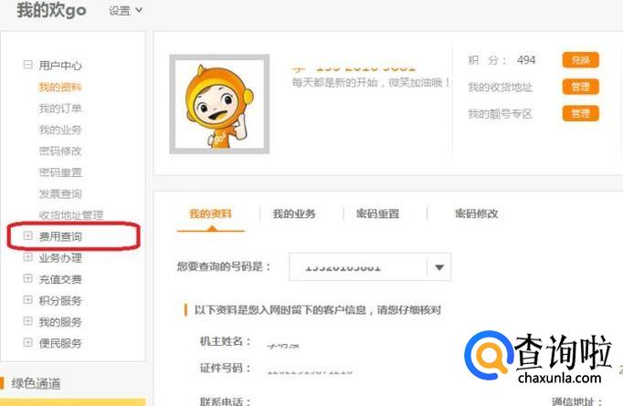 登录之后,就进入了用户中心界面了,此时,如图所示,我们点击左侧栏里的“费用查询”。