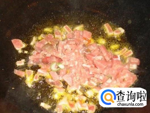 锅内放少许油,烧热后加入姜蒜,炒香后加入猪肉丁翻炒,猪肉丁变色后起锅。