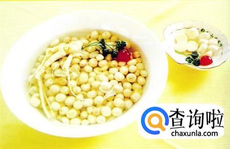 人参莲肉汤。用法:早晚服食。功效:益气健脾。制法:将人参与去心莲子放碗内,加水适量浸泡至透,再加入冰糖,蒸1小时左右。配方:白人参10克,莲子15克,冰糖30克。