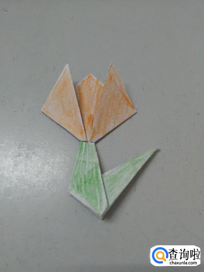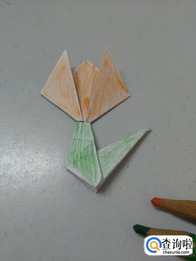 用笔将花朵涂成桔黄色,将叶子涂成绿色,一支郁金香就折完了。