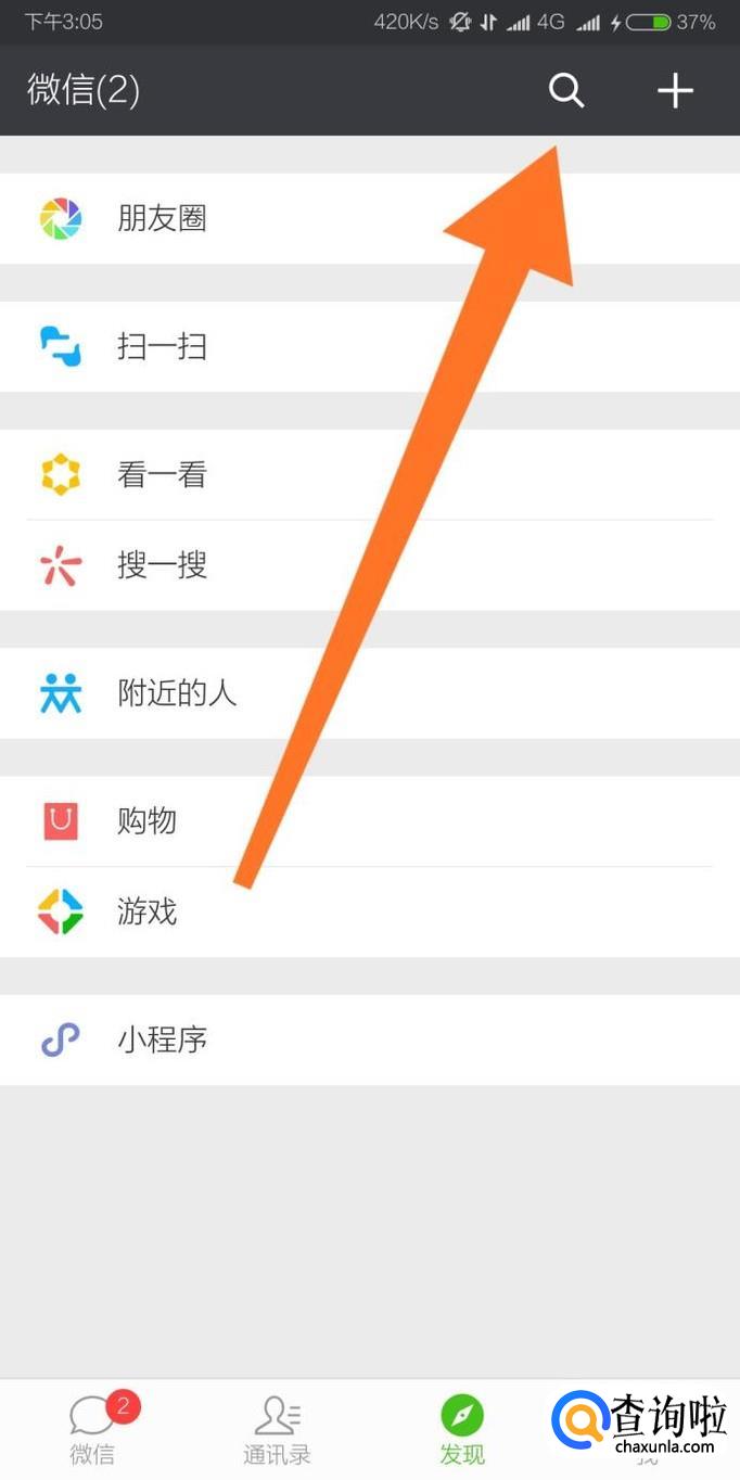 首先进入微信的“发现”页,点击右上角的搜索图标。