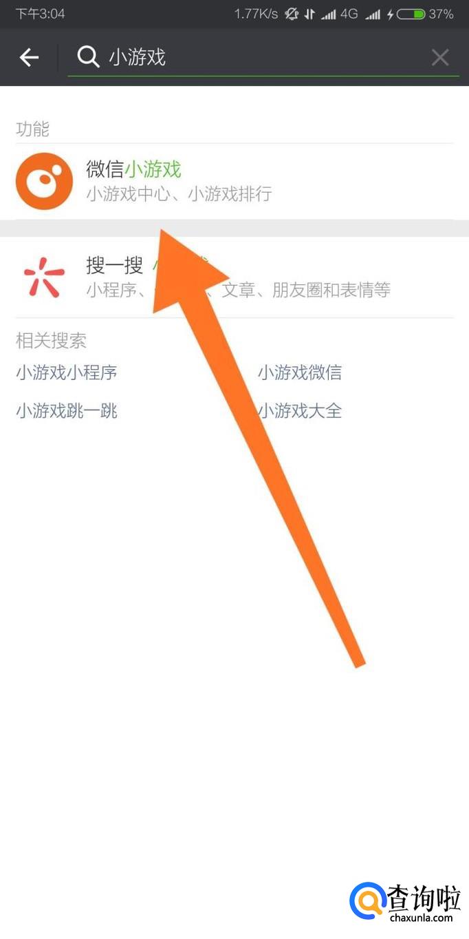 在搜索栏搜索“小游戏”,然后找到搜索结果“微信小游戏”,点击进入。