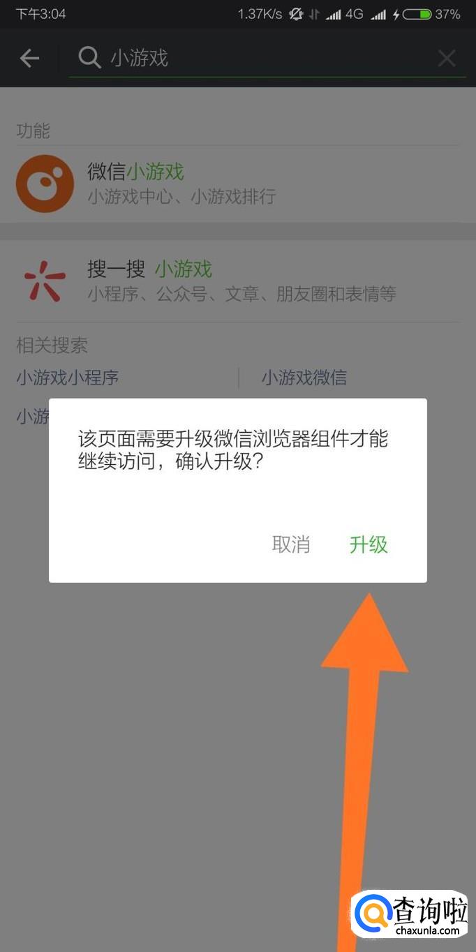 首次进入“微信小游戏”功能需要升级微信浏览器组件,点击“升级”即可。
