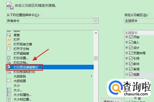 然后往下拉动页面,从中找出一项“打印预览编辑模式”,接着点击右侧对应的主选项卡的“视图”;