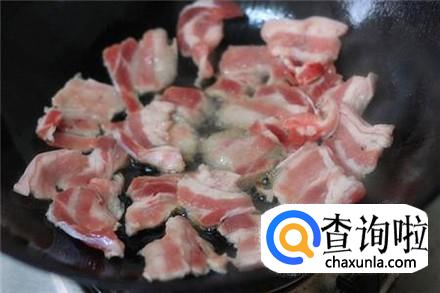锅里倒点食用油烧热,把肉片放进去小火慢慢的炒,让五花肉里面的油脂下来,变得有些许干的时候放一些葱花和姜丝,然后加点生抽和白糖翻炒。