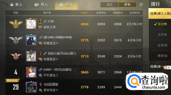 首先刺激战场的段位是分为单人、双人和四人的,在新的版本里还加入了第一人称,而且段位都是分开算的