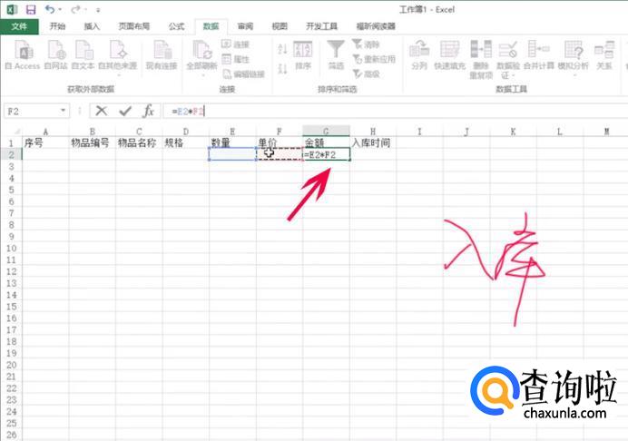 在入库表的计算中,金额需要利用很简单的方程式,点击金额之后,输入=E2*F2,这个方程式的意思就是金额=数量*单价。