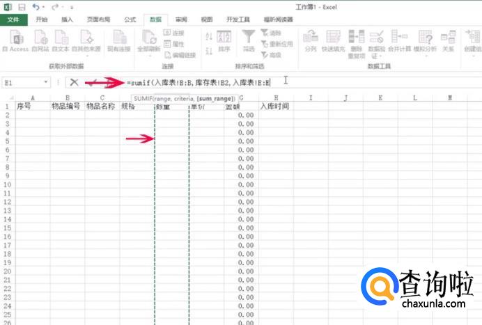 3个sheet创建好之后,回到入库表中,还需要对数量进行方程式设置,方程式为sumifs(入库表!B:B,库存表!B2,入库表!E:E),这样才能够对数量进行综合计算。
