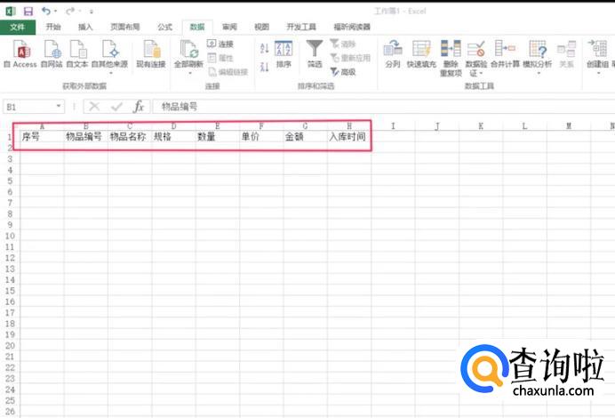 在每个sheet中,都要针对种类来创建几个类别,以下图入库为例,就需要序号、编号、名称、规格、数量、单价、金额和入库时间。