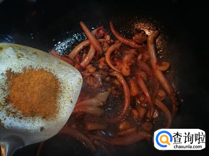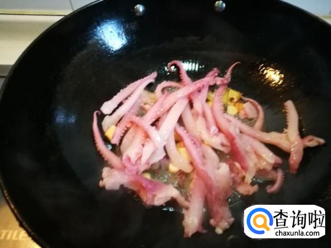等闻到了花椒煸出的香味,再下鱿鱼须到锅中。