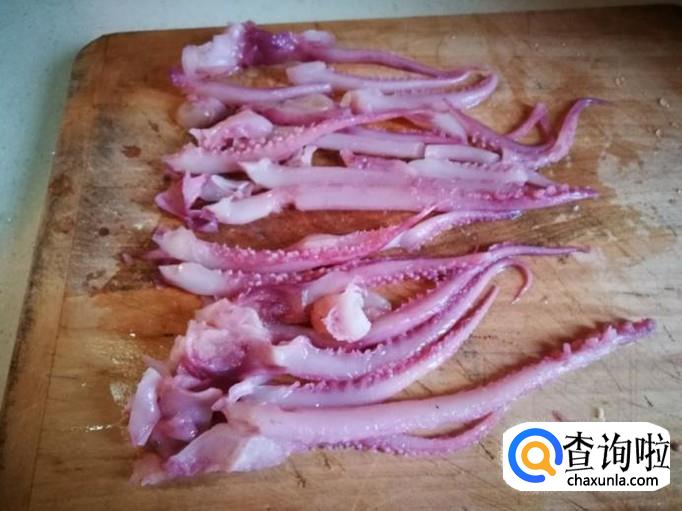 先把鱿鱼须洗净,去掉里面的黑膜,再切成一个长长的须条。