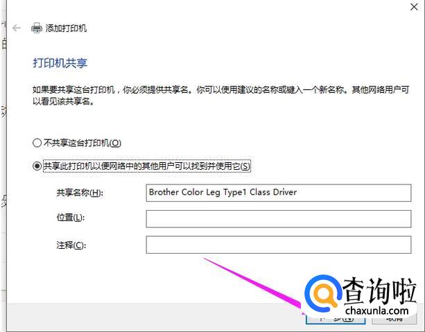 根据需要设置一下是否共享,如果是个人的就不需要选择共享,如果是公司之类的集体打印机,就可以选择共享打印机,然后继续点击进行下一步。