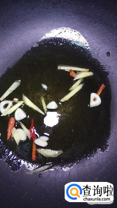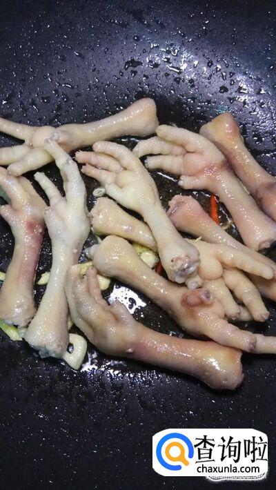 锅中放入适量油,油热后放入姜丝,蒜片,小米椒炒香,再将鸡爪放入锅中,搅拌均匀,炒一会儿。