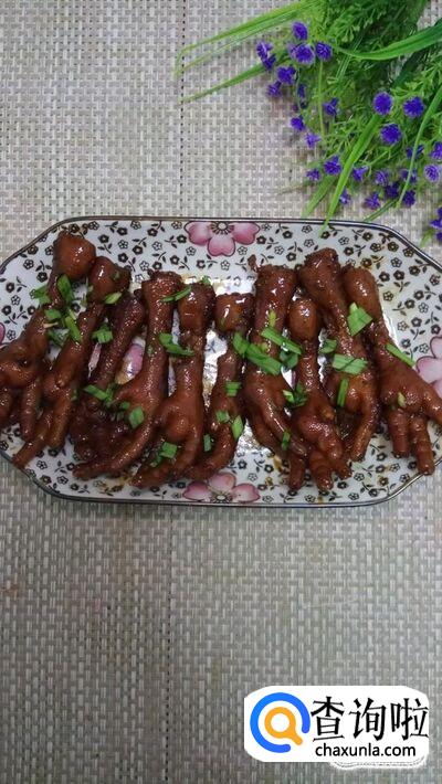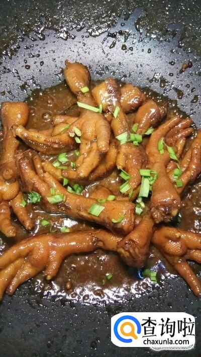 准备适量蒜苗,切碎后,撒入锅中,出锅装盘,美味的红烧凤爪就做好了,十分美味。