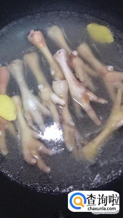 锅中烧开水,水开后放入姜和料酒,再将鸡爪放入锅中,焯水2到3分钟,捞出沥干水分,放入盘中备用。