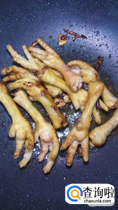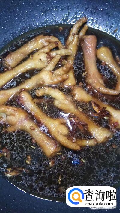 再放入适量花椒,八角,茴香,桂皮,翻炒一下,再加清水,没过鸡爪。