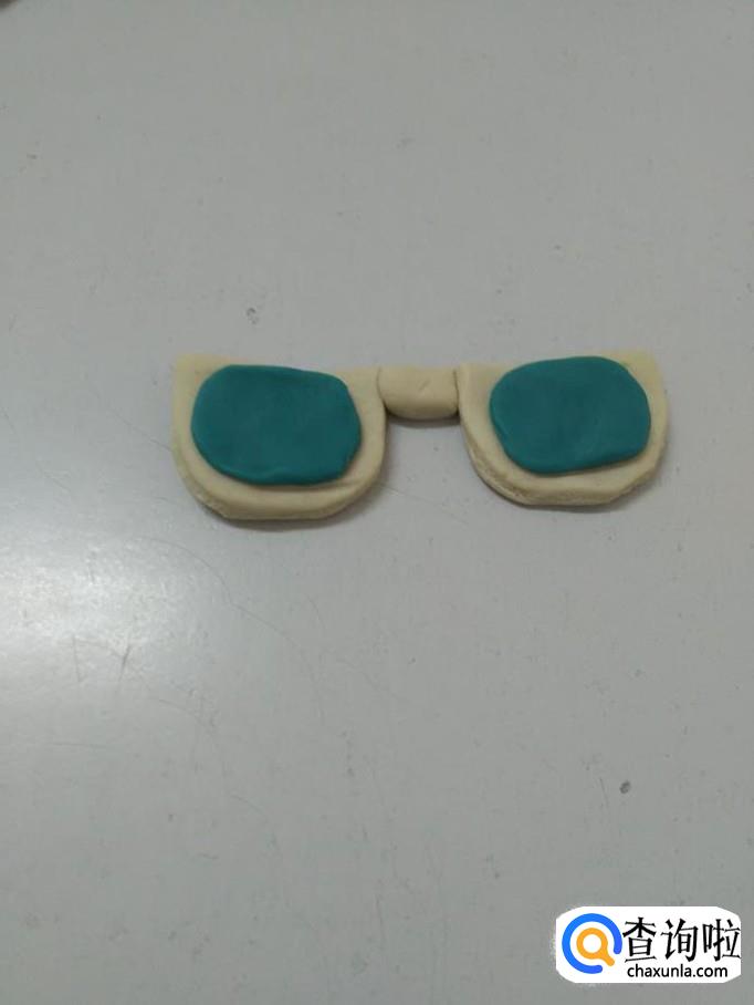 用蓝色捏两个椭圆形,粘在白色的眼镜框上,当作眼镜片。