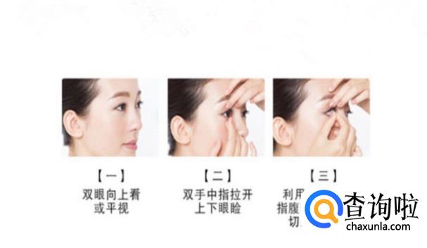 用左手将眼睛上下撑开,右手的大拇指和食指将眼睛取出,也可以用专门取眼镜工具夹出来。