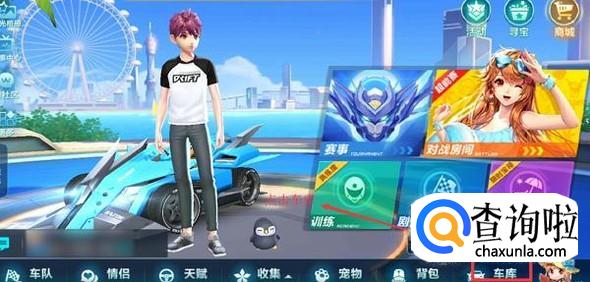 首先登录QQ飞车,然后点击右下角的车库按钮,如下图所示