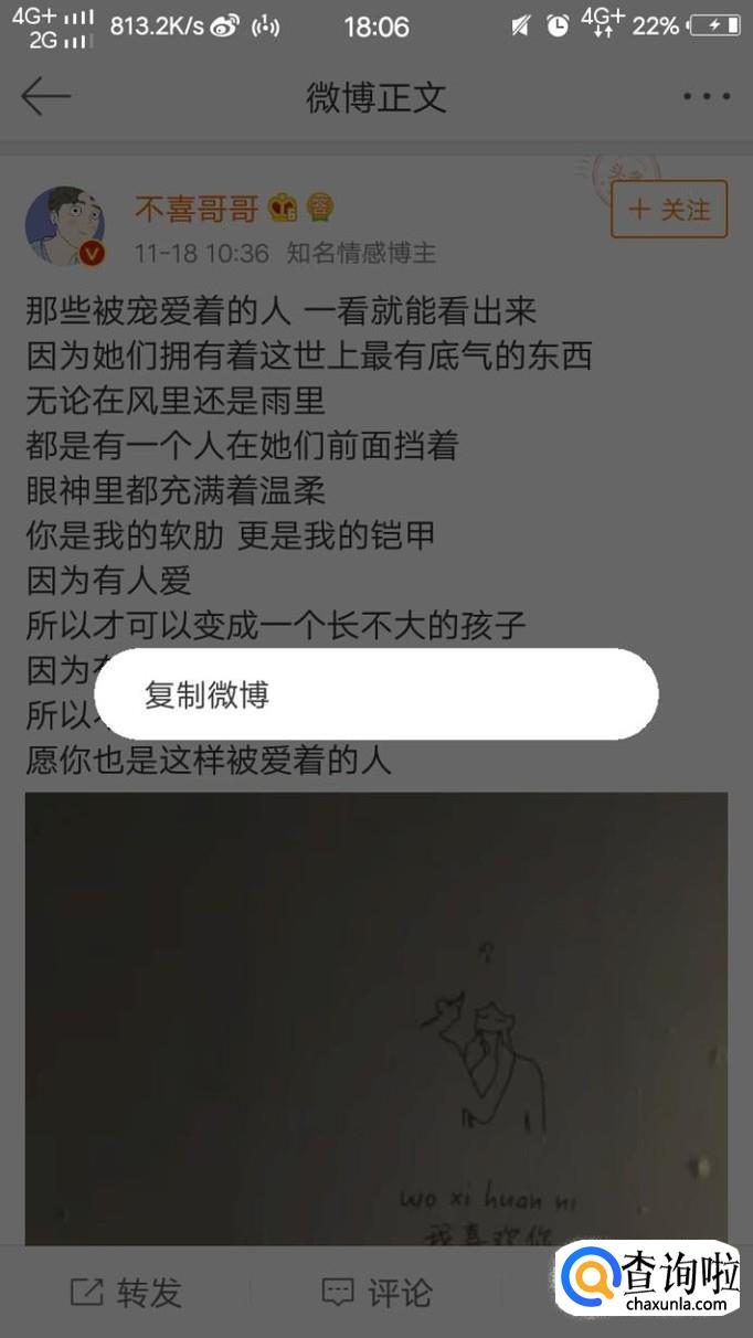 最后会跳出来一个复制微博,我们选择它就可以复制正文中的内容了。