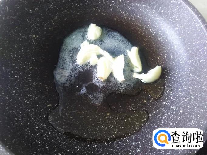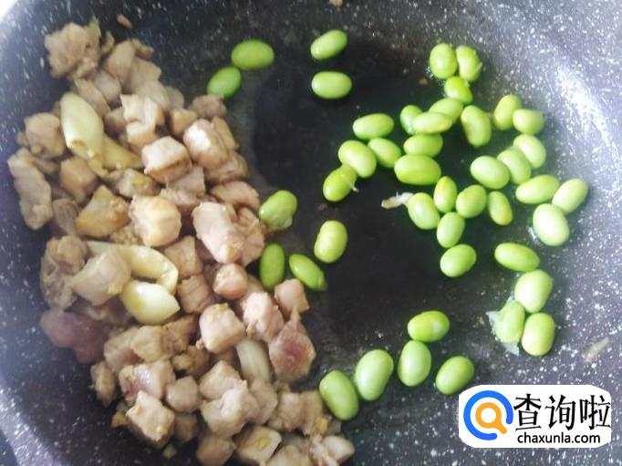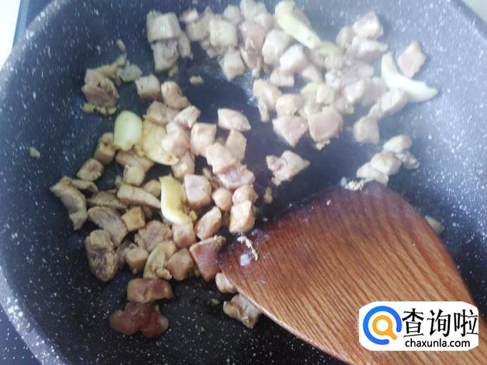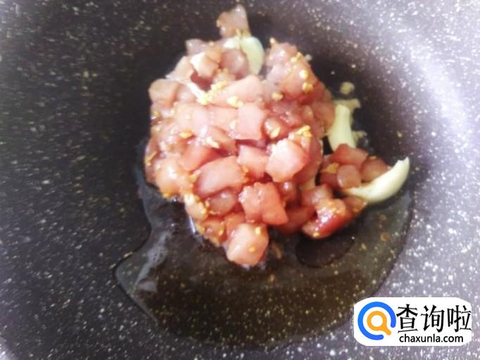 开火下油,放蒜米进去爆香,然后肉丁下锅,大火翻炒至变色。