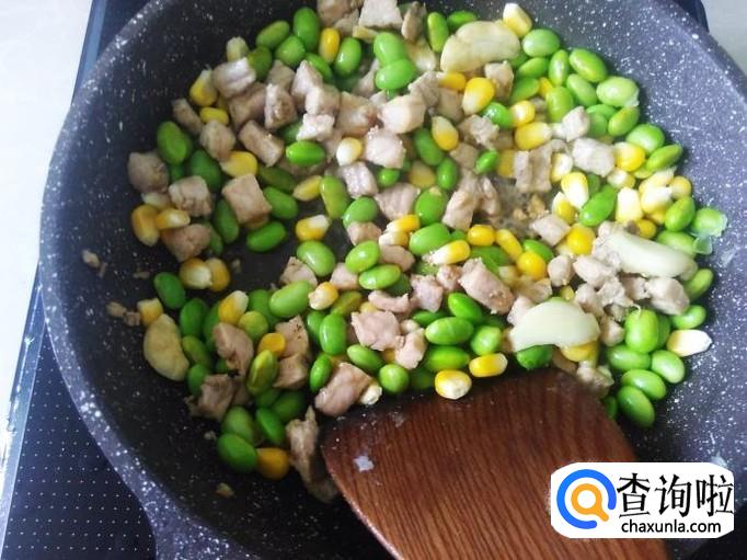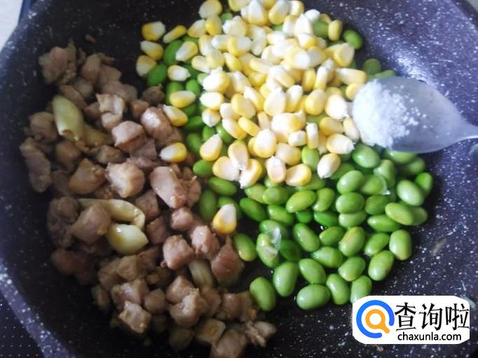 把肉丁铲到锅边,放青豆玉米进去,加适量的盐。
