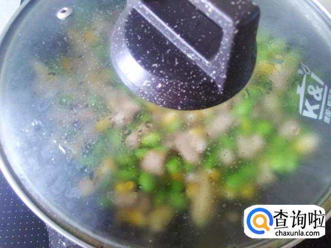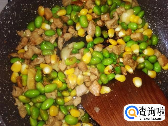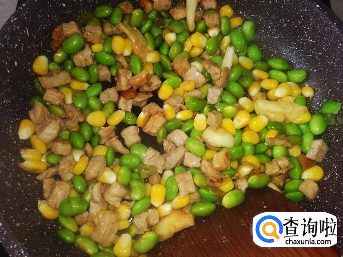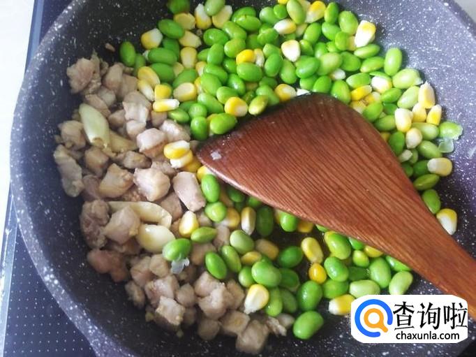 打开盖子翻炒一下,熄火。浓香清甜好吃的青豆玉米爆肉丁就做好了。