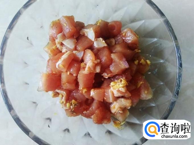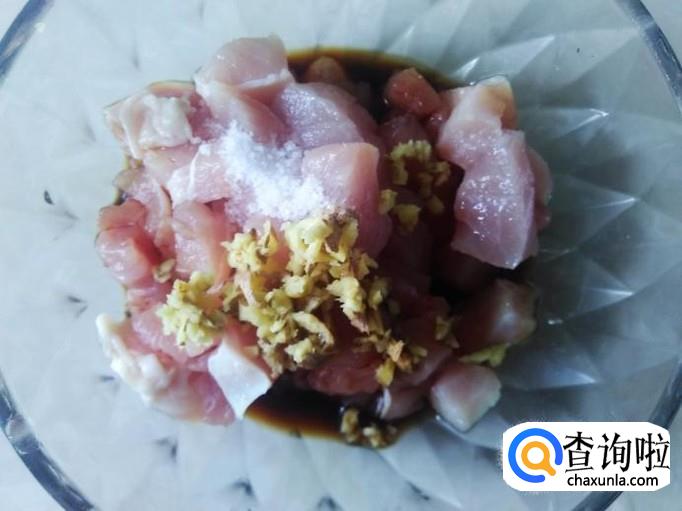 肉丁里加适量的盐、姜蓉、1勺生抽、1勺料酒腌制几分钟。