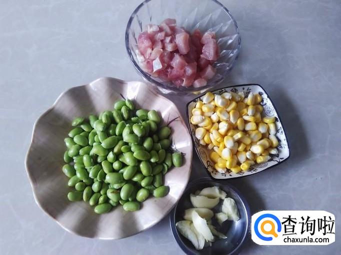 青豆100克,嫩甜玉米100克,瘦肉100克,蒜米适量,姜蓉适量,1勺生抽,1勺料酒。