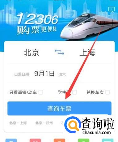 进入之后,在图示位置分别填上起始地和目的地,点击“查询车票”,如图所示。