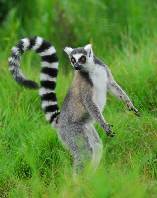 环尾狐猴属于原始灵长类,吻长、两眼侧向似狐,因尾具环节斑纹而得名。多5-20成群,栖多石少树的干燥地区,各有自己的领域。善跳跃攀爬,是地栖性较强的狐猴,主食昆虫、水果。3岁性成熟,孕期约4个半月,多为双仔。繁殖期在哺乳动物中最短,每年仅两周,一只雌猴接受雄猴的时间不足一天。寿命约18年。