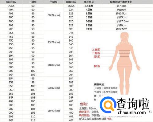 文胸尺码计算公式:文胸的尺码=胸下围的尺寸+杯级