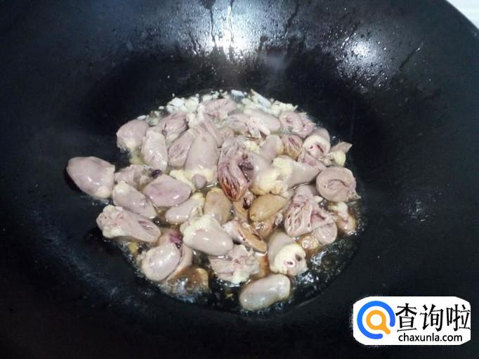 锅内放入油加热,油热后放入花椒,葱,姜,蒜,爆锅。放入鸡心翻炒。