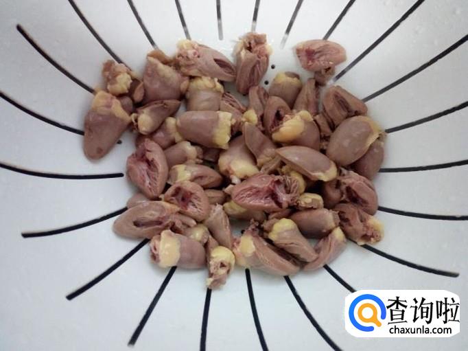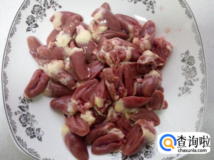 鸡心用水清洗干净,控干水分,切成对半,去除上面的血块和血管。