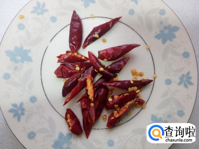 红干椒用水清洗干净,控干水分。把整个的红干椒斜刀切成半。
