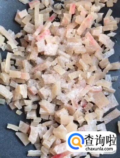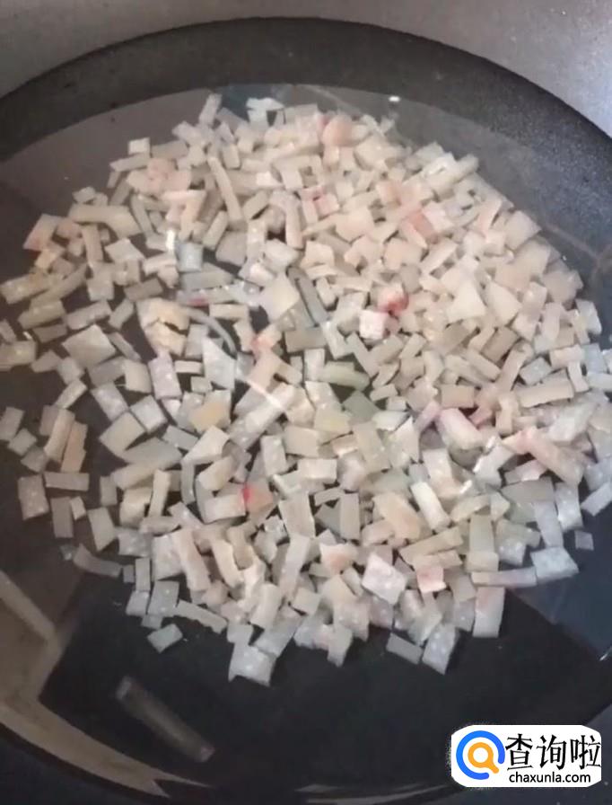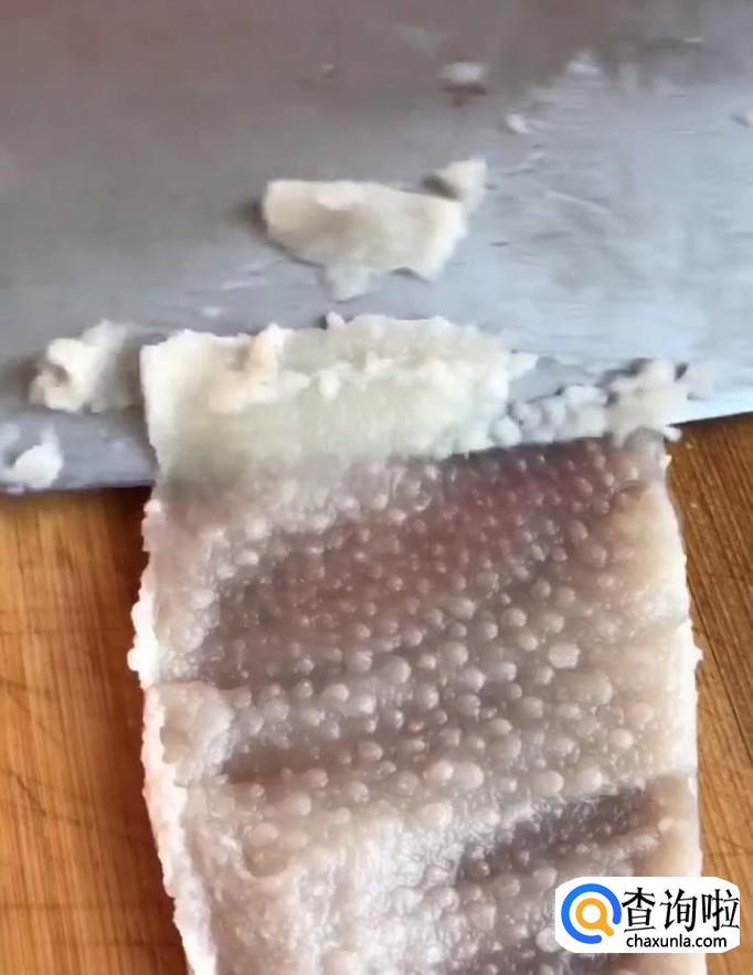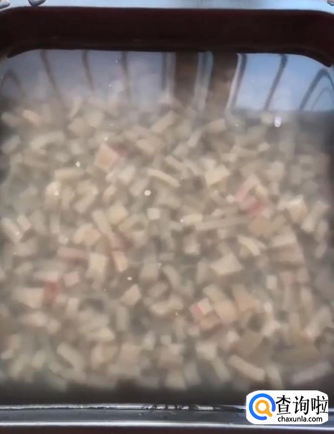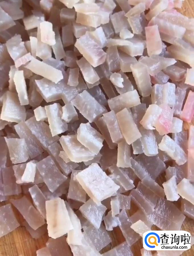 煮好以后,我们取出来放凉,接着我们将肉皮上的油脂去除,切成小丁