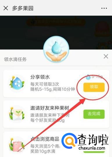 点击领水滴任务,打开一个小的菜单栏,如图所示。