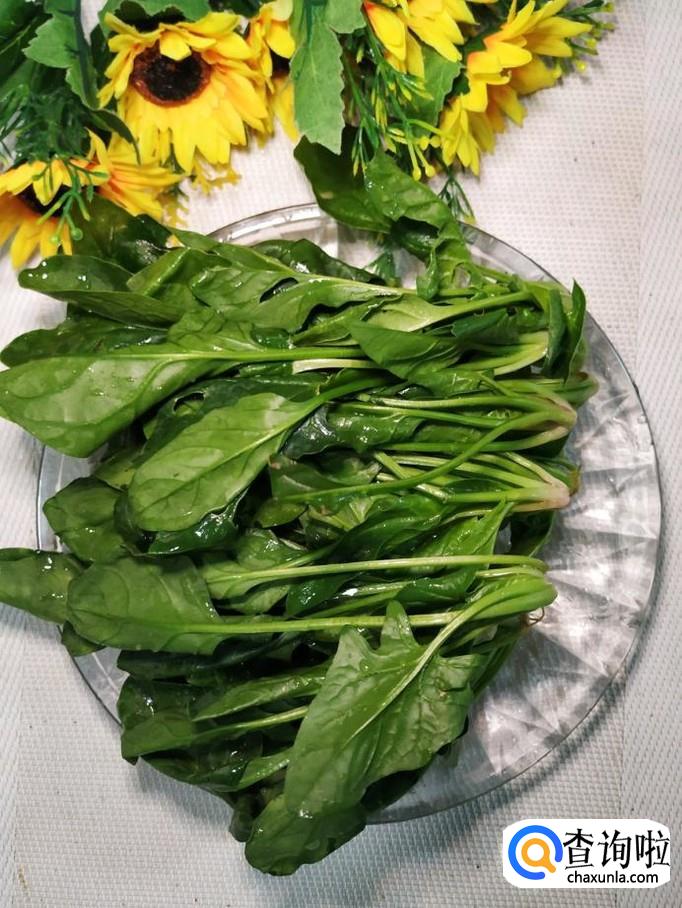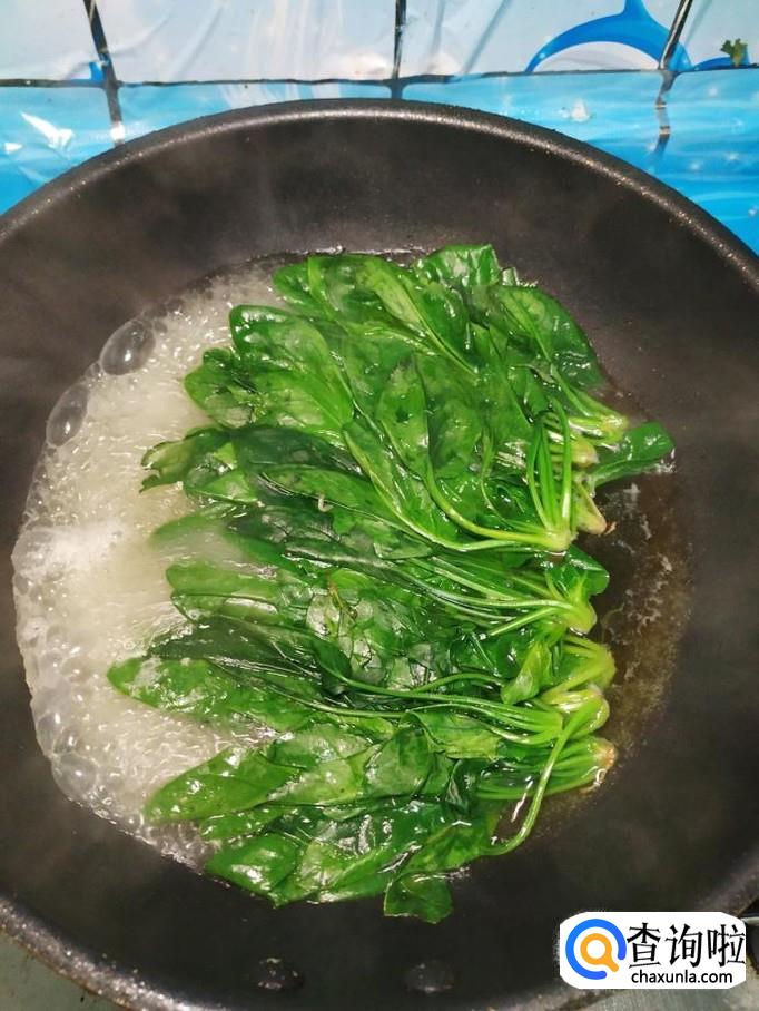 准备适量菠菜,洗净后去除根部,尽量将泥沙洗净,然后放入锅中焯水,捞出备用。