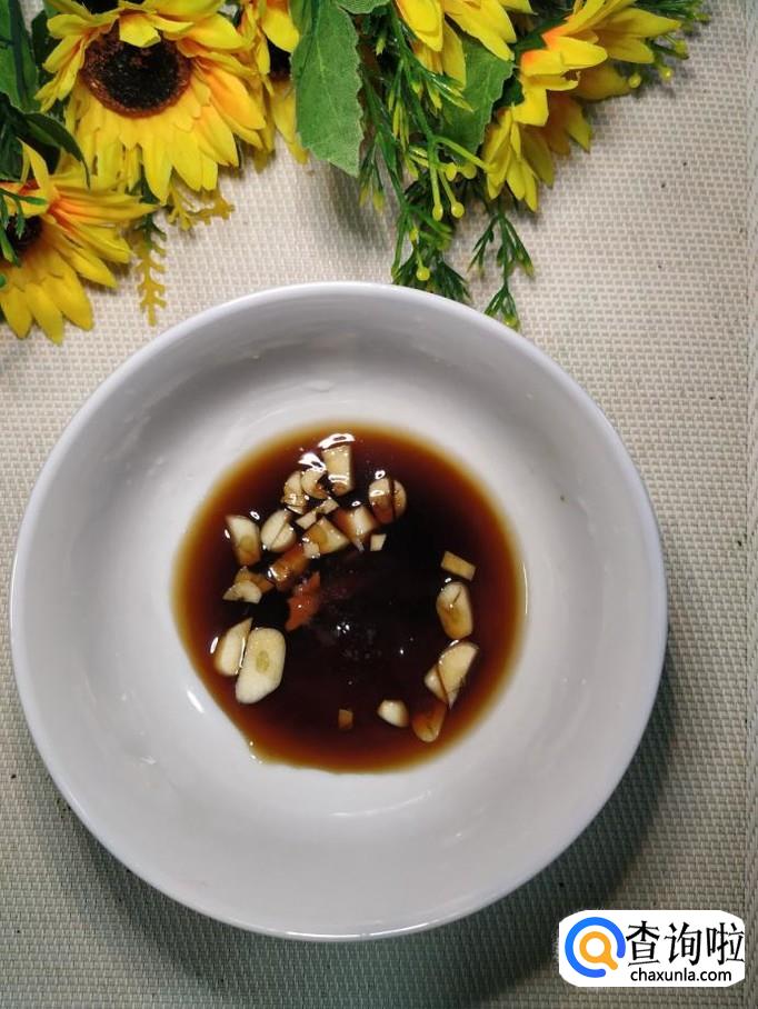 碗中放入适量蚝油,蒜片,料酒,生抽,盐,搅拌均匀,将调好的料汁儿倒入锅中。