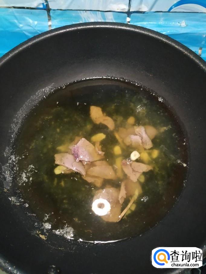 锅中烧开水,水开后,将猪肝放入锅中焯水,迅速捞出,放入盘中备用。