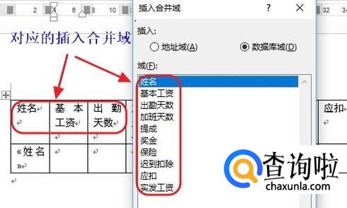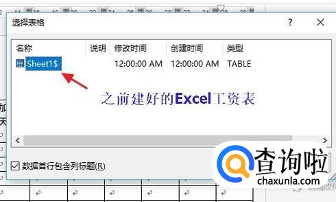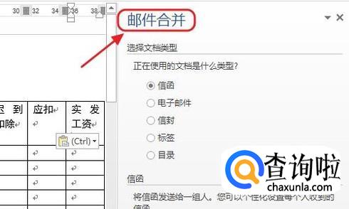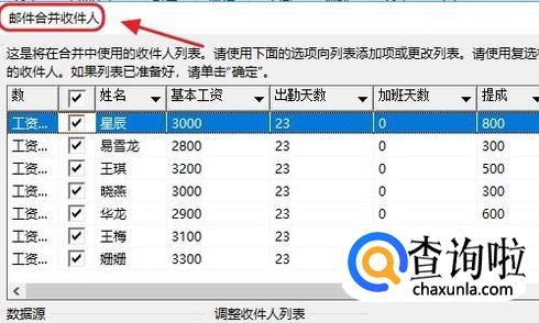 此时文档上方会弹出图一所示的“邮件合并收件人”对话框,也就是对应之前的工资表,我们检查一下是否有遗漏或者错误的地方,没有的话直接点击“确定”;