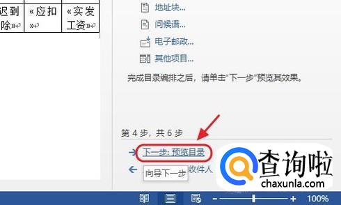这样我们就可以一直下一步到第5步,点击“预览目录”,这样就看到了第一位员工的工资条了;