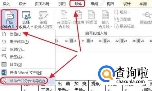 接着,我们在word文档中,依次点击“邮件”-“开始邮件合并”-“邮件合并分步向导”,此时文档的右侧就会弹出名为“邮件合并”的窗口,见下图二...