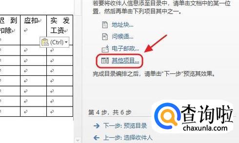 接下来我们点击下一步到第4步,点击该页面的“其他项目”,我们在表格的第二行依次对应的插入合并域,插入合并域完成之后的效果如图三...