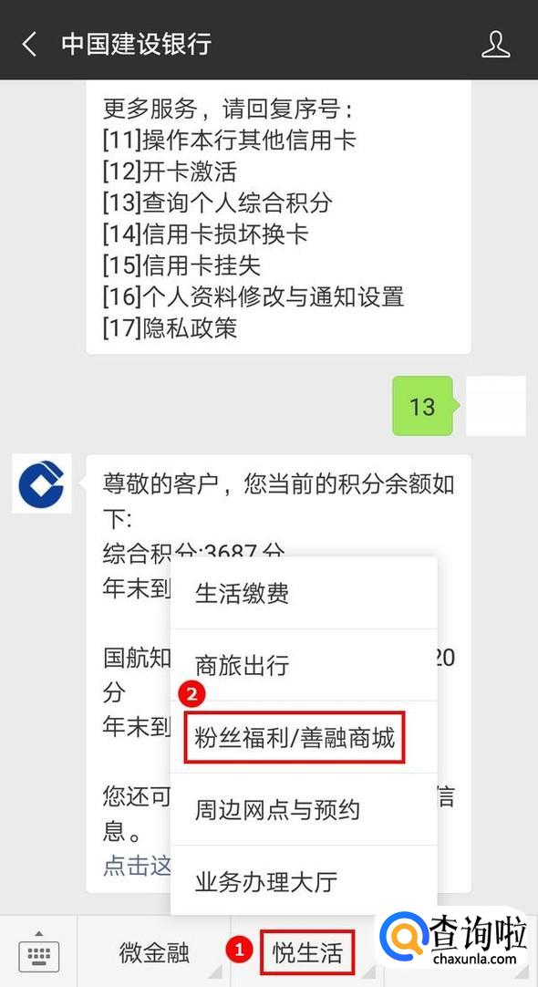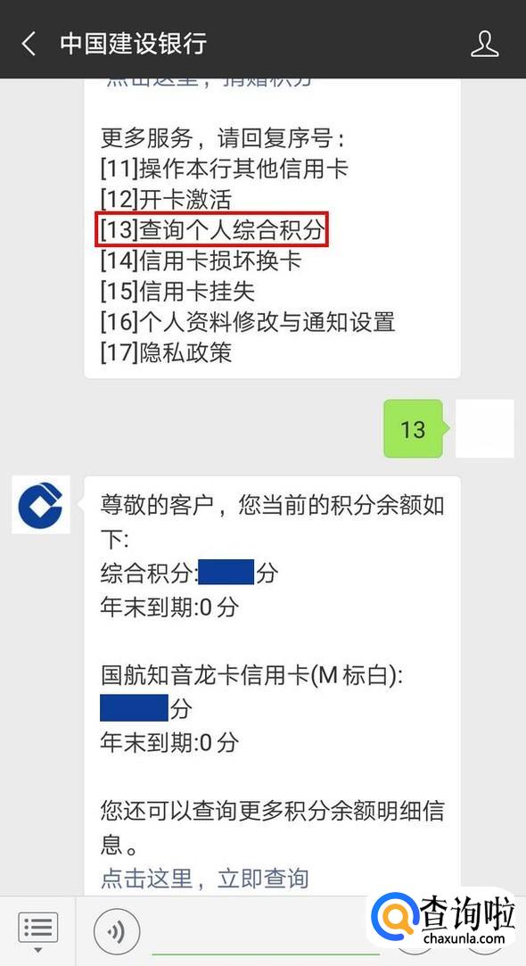 信用卡菜单下,点击“业务办理大厅”,根据提示发送“13”,查询个人综合积分;
